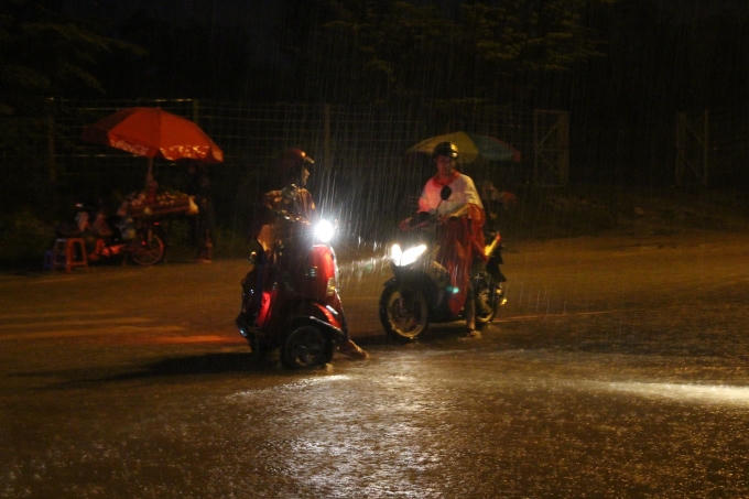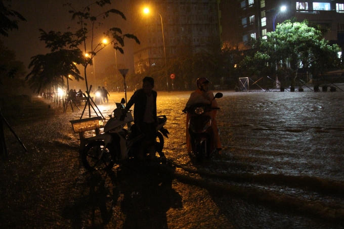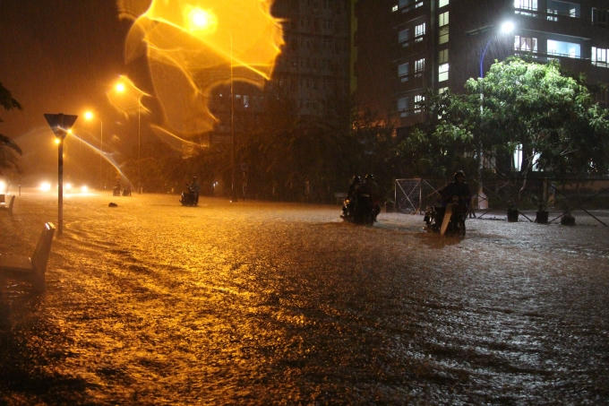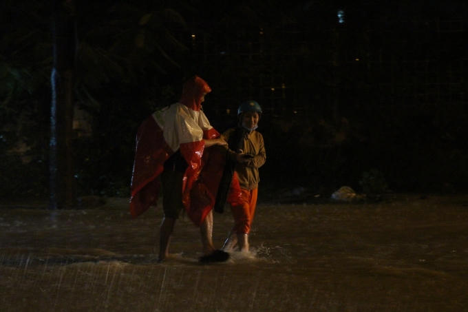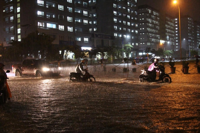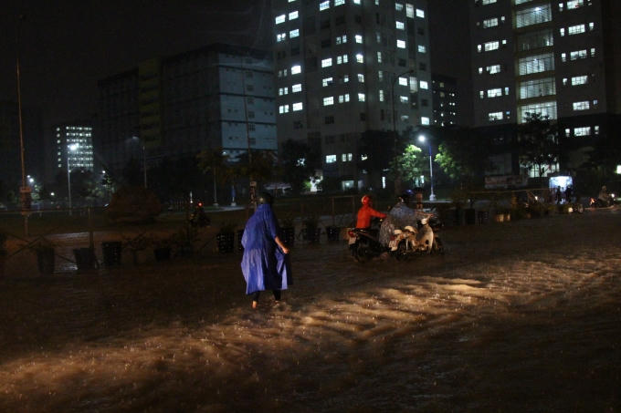 Cơn mưa lớn đã khiến đường dẫn về Kí túc xá ĐHQG TP HCM chìm trong biển nước. Nhiều sinh viên phải dắt bộ xe máy vì không thể đi được.