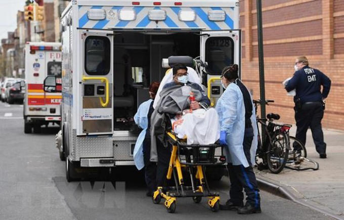 Nhân viên y tế chuyển bệnh nhân nhiễm COVID-19 lên xe cứu thương tới bệnh viện ở New York, Mỹ, ngày 7/4/2020. (Nguồn: AFP/TTXVN)