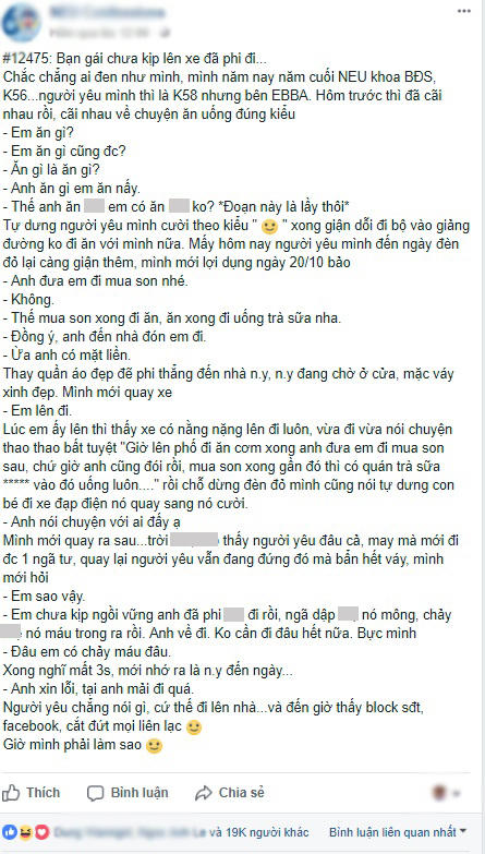 Theo như chàng trai kể lại, hai người giận nhau từ trước chỉ vì câu đùa bâng quơ. Tận dụng gần đến 20/10, chàng trai đã dỗ dành bằng những thứ nàng thích. Cứ nghĩ mọi thứ sẽ giải quyết bằng trà sữa, chàng hớn hở phóng về nhà, thay đồ chỉn chu rồi qua ngay nhà nàng đón đi chơi. Thế nhưng, lúc này mới là lúc khiến cho cô gái giận anh hơn bao giờ hết.