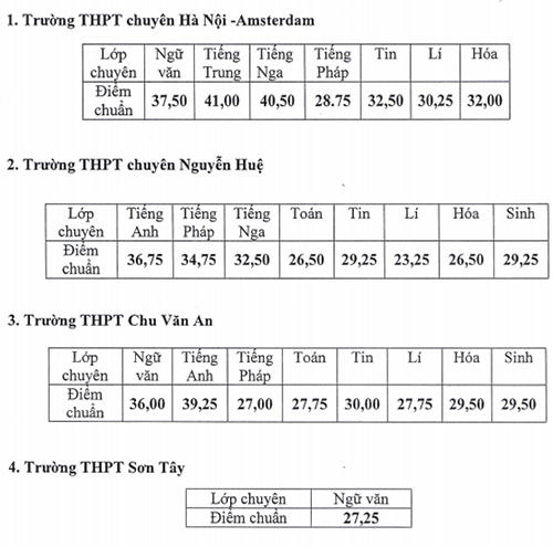 Trước đó ngày 21/6, Sở Giáo dục và Đào tạo Hà Nội đã công bố điểm chuẩn vào lớp 10 các trường chuyên, lớp chuyên. Cao điểm nhất là lớp tiếng Anh của chuyên Hà Nội - Amsterdam lấy tới 42,5, kế đó là tiếng Trung của trường này tới 41,75. Thấp điểm nhất là lớp chuyên Hóa của THPT Sơn Tây lấy 20.
