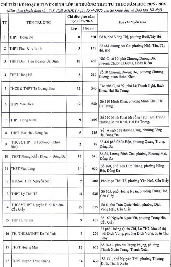 Theo đó, Sở GD&ĐT Hà Nội đã công bố danh sách chỉ tiêu tuyển sinh lớp 10, năm 2025-2026 của 77 trường tư thục trên địa bàn thành phố.
