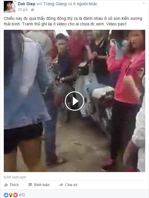 Người đưa video clip về nhóm phụ nữ đánh nhau ở Vũ Sơn, huyện Kiến Xương lên Facebook của mình có tên: Dak Diep với Trang Giang và có ghi như sau: "Chiều nay đy qua thì ra đánh nhau ở vũ sơn kiến xương thái bình. Tranh thủ ghi lại ít video cho ai chưa được xem".