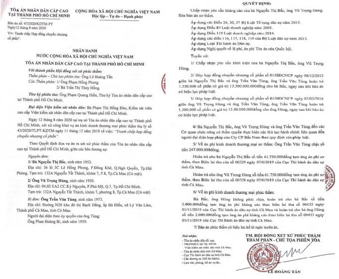 Bản án số 47/2020/KDTM-PT của TAND Cấp cao tuyên huỷ các hợp đồng chuyển nhượng cổ phần giữa nguyên đơn bà Bắc - ông Hùng và bị đơn là ông Trần Văn Tùng.