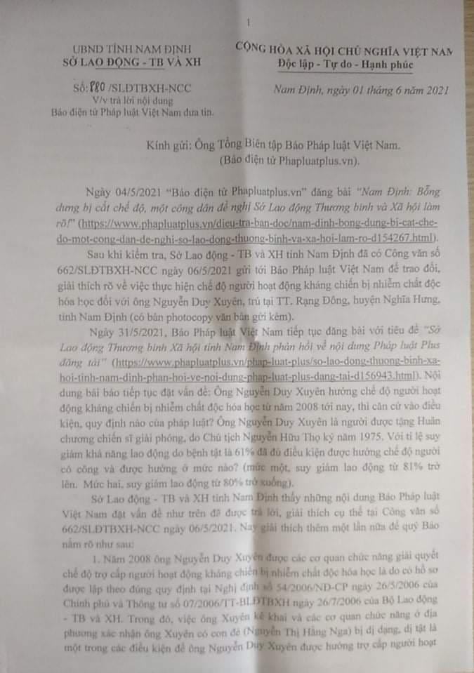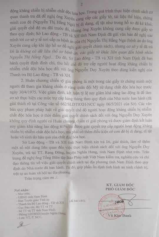 Trong công văn này, Sở LĐTB& Xã hội tỉnh Nam Định cho biết: Năm 2008, ông Nguyễn Duy Xuyên được các cơ quan chức năng giải quyết chế độ trợ cấp người hoạt động kháng chiến bị nhiễm chất độc hóa học là do có hồ sơ được lập theo đúng quy định tại Nghị định số 54/2006/NĐ-CP ngày 26/5/2006 của Chính phủ và Thông tư số 07/2006/TT-BLĐTBXH ngày 26/7/2006 của Bộ LĐTB&XH.