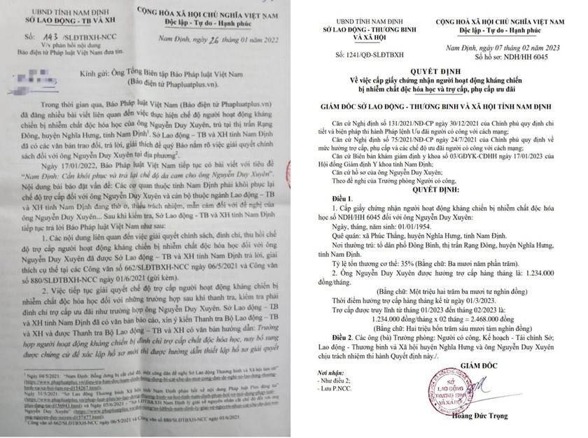 Sau loạt bài đăng tải của báo Pháp luật Việt Nam về việc, “cần khôi phục lại chế độ da cam cho ông Nguyễn Duy Xuyên”, ngày 07/02/2023, Sở LĐTB&XH tỉnh Nam Định đã ban hành Quyết định số 1241/QĐ-SLĐTBXH về việc cấp giấy chứng nhận người hoạt động kháng chiến bị nhiễm chất độc hóa học và trợ cấp, phụ cấp ưu đãi. Nội dung quyết định như sau: “Căn cứ Nghị định số 131/2021/NĐ-CP ngày 30/12/2021 của Chính phủ quy định chi tiết và biện pháp thi hành pháp lệnh ưu đãi người có công với Cách mạng… Căn cứ biên bản khám giám định y khoa số 03/GĐYK-CĐHH ngày 17/01/2023 của Hội đồng Giám định Y khoa tỉnh Nam Định. Căn cứ hồ sơ của ông Nguyễn Duy Xuyên. Quyết định: cấp giấy chứng nhận người hoạt động kháng chiến bị nhiễm chất độc hóa học số NDH/HH6045 đối với ông Nguyễn Duy Xuyên (sinh ngày 01/01/1954, trú tại tổ dân phố Đông Bình, thị trấn Rạng Đông, huyện Nghĩa Hưng, tỉnh Nam Định), tỉ lệ tổn thương cơ thể là 35% - ông Nguyễn Duy Xuyên được hưởng trợ cấp hàng tháng là 1.234.000 VNĐ. Thời điểm hưởng trợ cấp hàng tháng kể từ 01/3/2023. Trợ cấp được truy lĩnh từ tháng 01/2023 đến tháng 02/2023 là 2.468.000 VNĐ”- trích Quyết định số 1241.