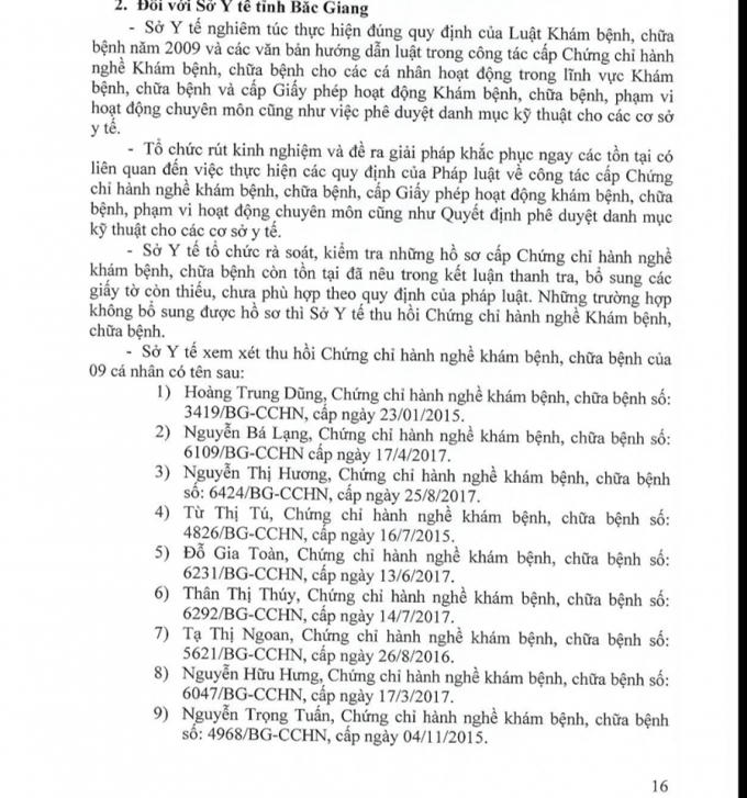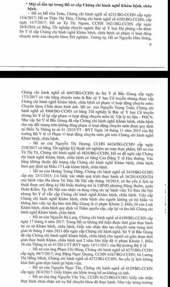 Theo Kết luận này Cục trưởng Cục Quản lý Khám, chữa bệnh - ông Lương Ngọc Khuê đã chỉ rõ gần 30 trường hợp cụ thể được cấp Chứng chỉ hành nghề Khám bệnh, chữa bệnh được cấp không đúng quy định và một số hồ sơ của bệnh viện Phổi Bắc Giang có một số giấy tờ không đúng quy định.