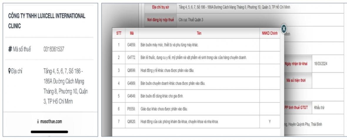 - Công ty TNHH LuxCell International Clinic do ông P.H.T. làm giám đốc, được Sở Kế hoạch và Đầu tư TP.HCM cấp, hoạt động từ ngày 20/3/2024, tại địa chỉ tầng 4, 5, 6, 7 với ngành nghề kinh doanh là hoạt động của các phòng khám đa khoa, chuyên khoa và nha khoa, hoạt động y tế khác chưa được phân vào đâu... Sau kiểm tra 3 ngày, công ty này đổi tên thành Công ty TNHH BW International Clinic, cũng do ông P.H.T. làm giám đốc (mã số doanh nghiệp, địa chỉ, tầng không thay đổi).