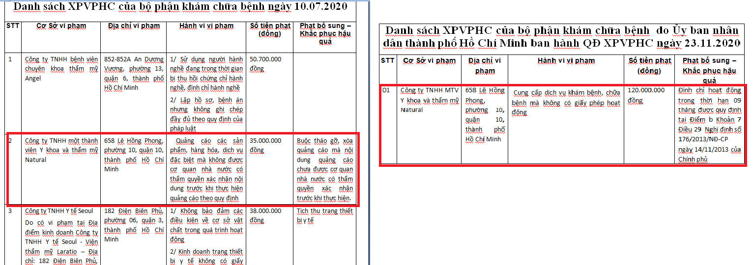 Thông tin xử phạt vi phạm hành chính của Công ty TNHH một thành viên Y khoa và thẩm mỹ Natural vào năm 2020.