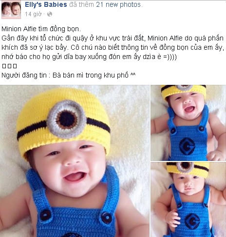"Minion Alfie tìm đồng bọn. Gần đây khi tổ chức đi quậy ở khu vực trái đất, Minion Alfie do quá phấn khích đã sơ ý lạc bầy. Cô chú nào biết thông tin về đồng bọn của em ấy, nhớ báo cho họ gửi dĩa bay xuống đón em ấy dzìa è. Người đăng ti : Bà bán mì trong khu phố".