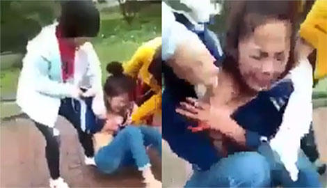 Trong clip, nữ sinh mặc đồng phục bị đánh liên tục van xin. Thế nhưng hai đối tượng kia vẫn không dừng tay mà liên tiếp túm tóc, lột áo của nữ sinh mặc đồng phục.