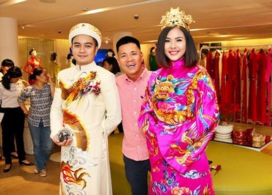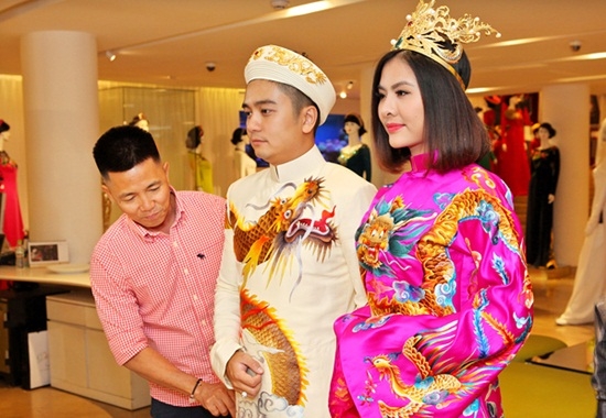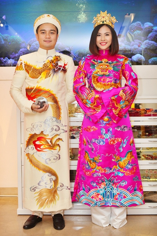 Đây là thiết kế độc đáo của NTK Đinh Văn Thơ dành riêng cho vợ chồng Vân Trang. Theo Vân Trang chia sẻ, để có được chiếc áo như thế này 6 nghệ nhân đã chăm chỉ, tỉ mỉ trong 3 tháng để thêu những họa tiết kỳ công, hình con rồng mềm mại, tinh sảo từng đường nét.