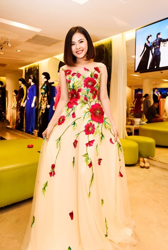 Ngoài bộ trang phục áo dài truyền thống, cô còn lựa chọn cho mình những bộ đầm xòe họa tiết sặc sỡ giúp cô tạo điểm nhấn và cuốn hút trong ngày lễ trọng đại.