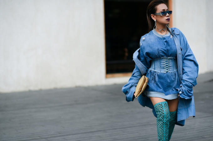 Với bộ đầu tiên, Lyskeli tham gia chụp hình với style denim on denim kết hợp corsec, chất liệu thô ráp casual với điểm nhấn hot belt corsec và đôi bốt turquoise.