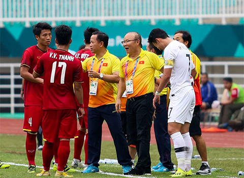 HLV Park Hang Seo chủ động yêu cầu các học trò đá bóng ra ngoài sân để bộ phân y tế vào chăm sóc cho cầu thủ đội bạn. Tranh thủ thời gian bóng “chết”, thầy Park gọi các học trò ra uống nước, đồng thời có những chỉnh đốn về chiến thuật.
