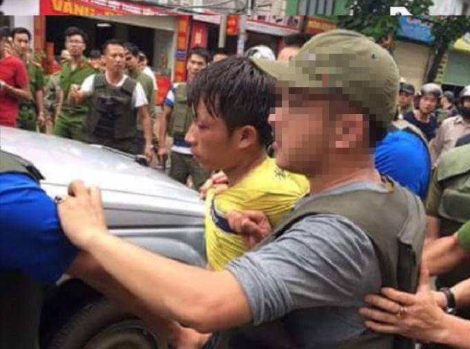 | Đối tượng Bình (áo vàng), bị lực lượng chức năng bắt giữ sau 1 ngày gây án. |