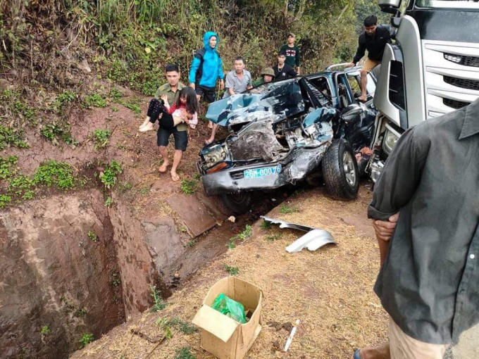 Vụ va chạm mạnh đã khiến 1 người chết, 6 người bị thương. Tại hiện trường, 2 chiếc xe bị hư hỏng nặng, xe biển xanh nằm ở dưới rãnh thoát nước.