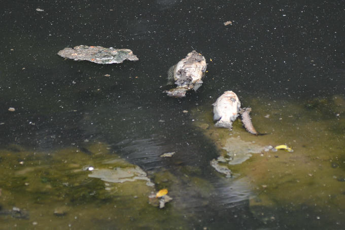 Chiều 14/7, nước sông Tô Lịch đã chuyển màu đen trở lại, cá chết nổi trắng sau khi trong xanh hơn nhờ được xả 1 triệu m3 nước từ Hồ Tây...
