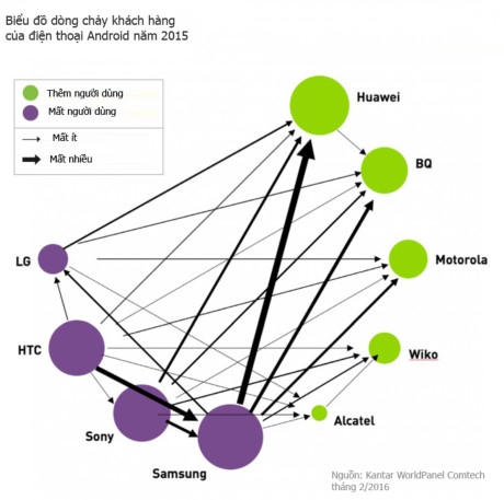 Trong bảng biểu tóm tắt nói trên, có thể thấy hầu hết các ông lớn di động Android như Sony, Samsung, LG, HTC đều mất đi một lượng lớn khách hàng về tay một số hãng nhỏ. Trong đó HTC là hãng mất đi nhiều khách hàng nhất còn Huawei nổi lên như là một lựa chọn hấp dẫn của người dùng Android.