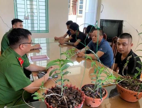 Nhóm đối tượng cùng tang vật lan Phi điệp đột biến lừa đảo chiếm đoạt tài sản 166 triệu đồng tại cơ quan công an huyện Yên Thủy.