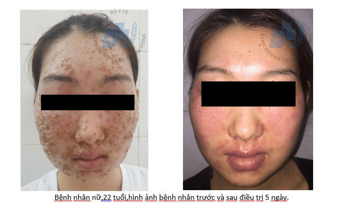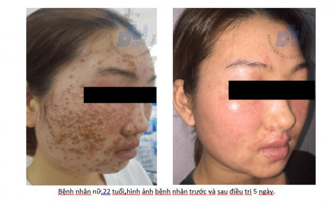 Ngay sau đó, chị Anh Thư đã ngừng sử dụng loại bột rửa mặt này nhưng triệu chứng ngứa rát vẫn không giảm khiến người bệnh gãi và chà xát nhiều tạo ra nhiều vết xây xước trên da. Tuy nhiên bản thân vẫn chủ quan cho rằng chỉ dị ứng thông thường nên không đi khám tại cơ sở y tế. Chỉ đến khi toàn bộ vùng mặt xuất hiện các tổn thương mụn nước một cách cấp tính và nhanh chóng dập vỡ để lại nhiều vết trợt và vảy tiết trên da kèm theo sốt 38 độ C thì bệnh nhân mới đến khám tại Bệnh viện Da liễu Trung ương.