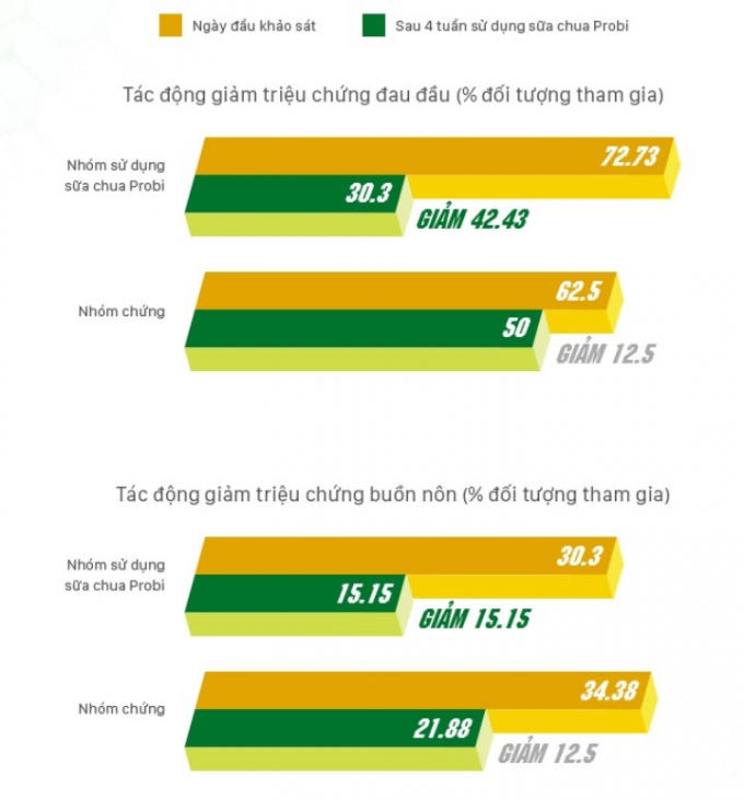 Theo đó, qua nghiên cứu này, các nhà khoa học đã chứng minh được hiệu quả của sữa chua uống Vinamilk Probi với đối tượng nam giới sử dụng dụng rượu, bia thường xuyên thể hiện rõ ở 3 tác dụng: làm giảm men gan, giúp cải thiện chức năng gan; cải thiện nồng độ miễn dịch IgA và giúp hạn chế viêm loét dạ dày hành tá tràng; giảm triệu chứng đau đầu và buồn nôn.