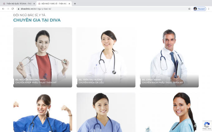 Thậm chí, có nơi còn sử dụng cả bác sĩ, y tá “ảo” - dùng photoshop hình ảnh bác sĩ của trang web nước ngoài rồi “hô biến” thành nhân sự của cơ sở mình. Thẩm mỹ Quốc tế Diva là một trường hợp như vậy.