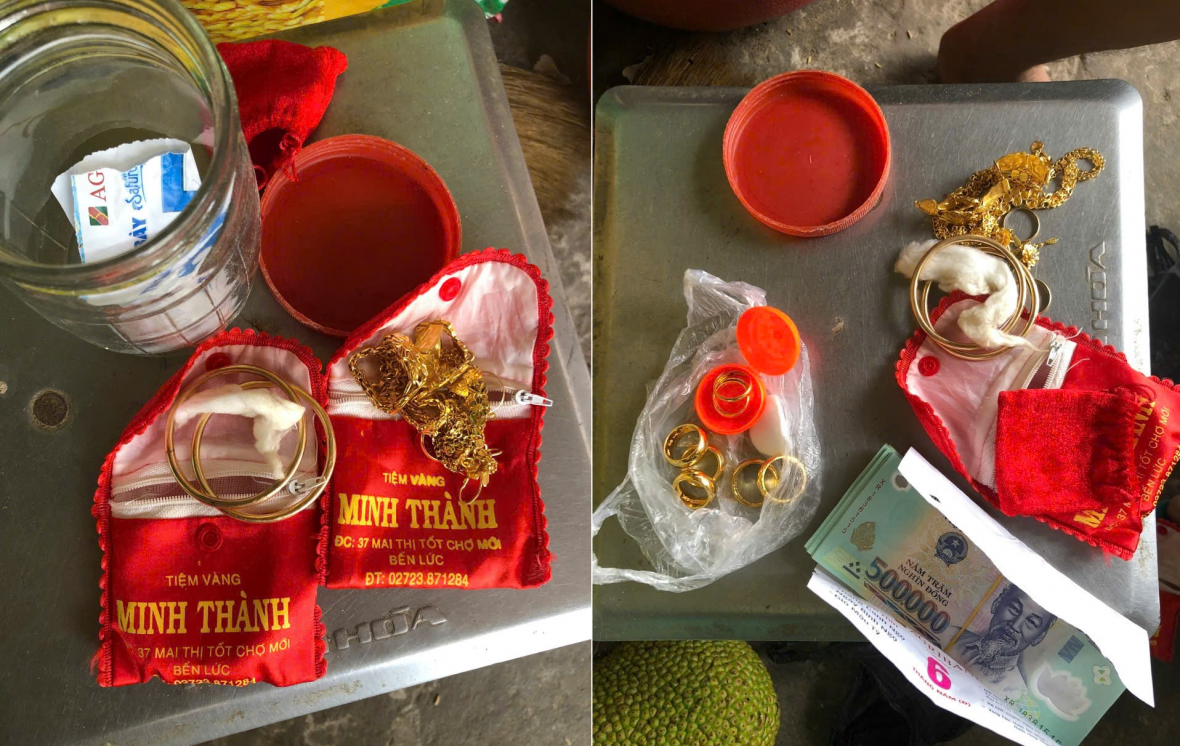Khi vừa đổ lúa ra thau để chuẩn bị chà gạo, anh Khải bất ngờ phát hiện trong bao có những vật thể lạ: nhẫn vàng, dây chuyền và một xấp tiền mặt.