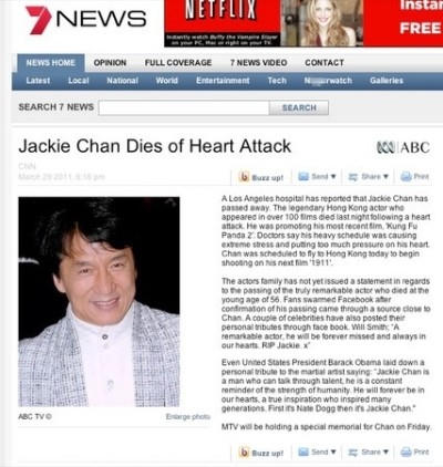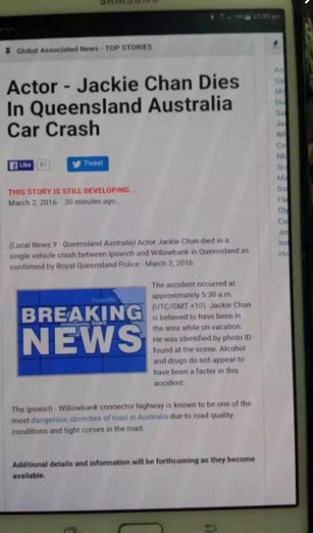 Mới đây, hàng loạt báo chí của Anh, Ấn Độ… và nhiều nước khác rầm rộ đưa tin ngôi sao võ thuật Thành Long qua đời ở Queensland, Australia do tai nạn xe hơi.