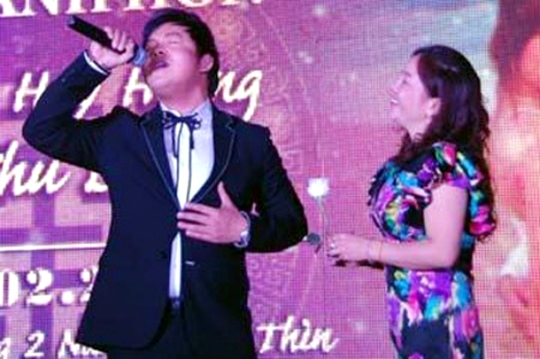 | Ca sĩ Quang Lê hát ở đám cưới, có khán giả hâm mộ đợi sẵn để tặng hoa. |