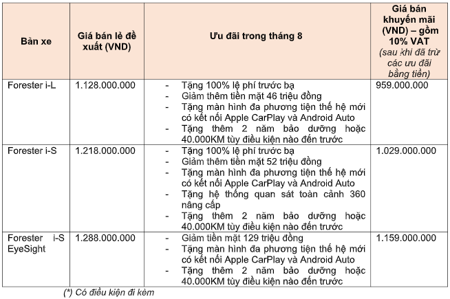 Subaru Việt Nam thực hiện chương trình ưu đãi dành cho dòng xe Subaru Forester i-L, i-S và i-S EyeSight từ ngày 17 đến hết 31/8. Cụ thể, bản i-L giảm tiền mặt 46 triệu đồng và tặng 100% lệ phí trước bạ; bản i-S giảm tiền mặt 52 triệu đồng và tặng 100% lệ phí trước bạ; còn bản i-S EyeSight được giảm tiền mặt 129 triệu đồng.