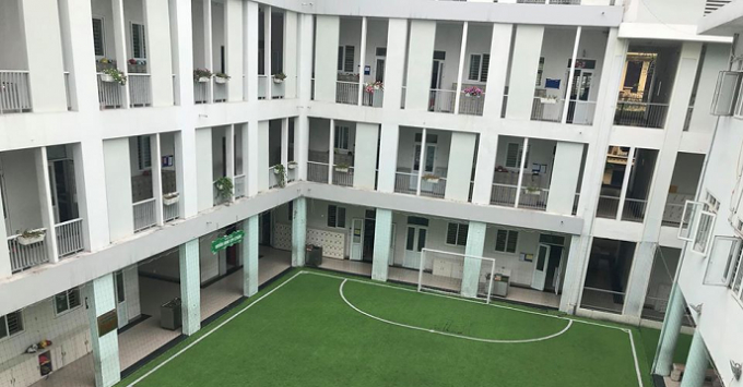 | Khuôn viên trường Tiểu học B nơi học sinh C. không may bị rơi từ tầng 4 xuống đất. |