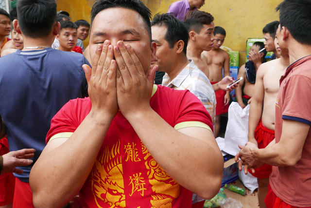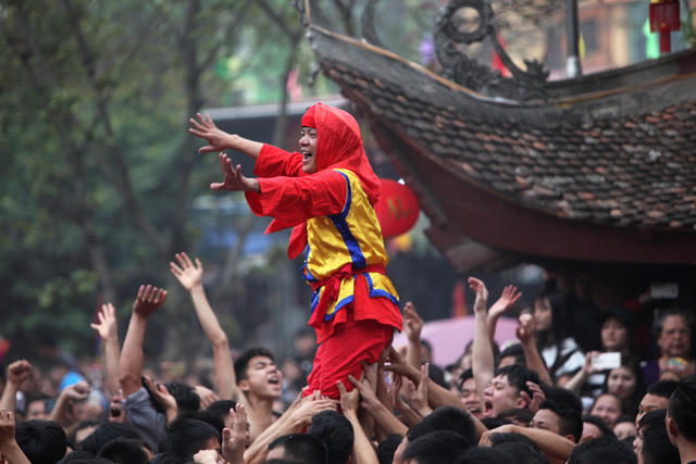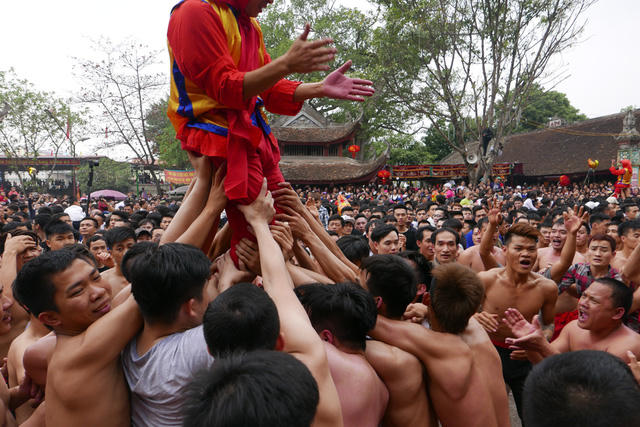 Gần trăm trai tráng phô diễn sức mạnh trong màn phối hợp rước ông đám ở hội pháo Đồng Kỵ (Từ Sơn, Bắc Ninh) diễn ra sáng nay, mùng 4 Tết.