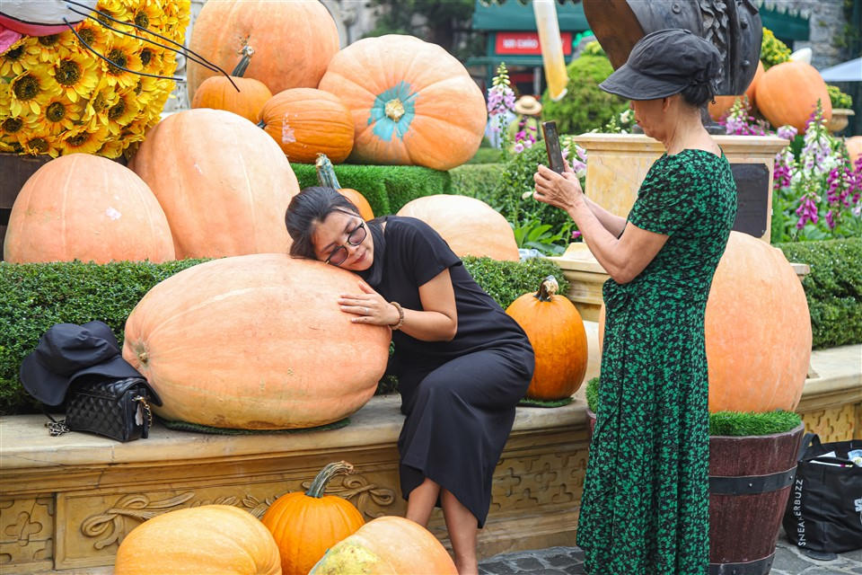 Ấn tượng nhất là những tiểu cảnh, mâm cỗ khổng lồ được kiến tạo từ những quả bí ngô đủ màu sắc và hình dáng, được đặt tại khu vực Đài phun nước và Quảng trường Hội tụ. Đông đảo du khách hào hứng check in với tiểu cảnh bí ngô khổng lồ để ghi lại khoảnh khắc kỷ niệm lễ hội mùa thu trên đỉnh Bà Nà.