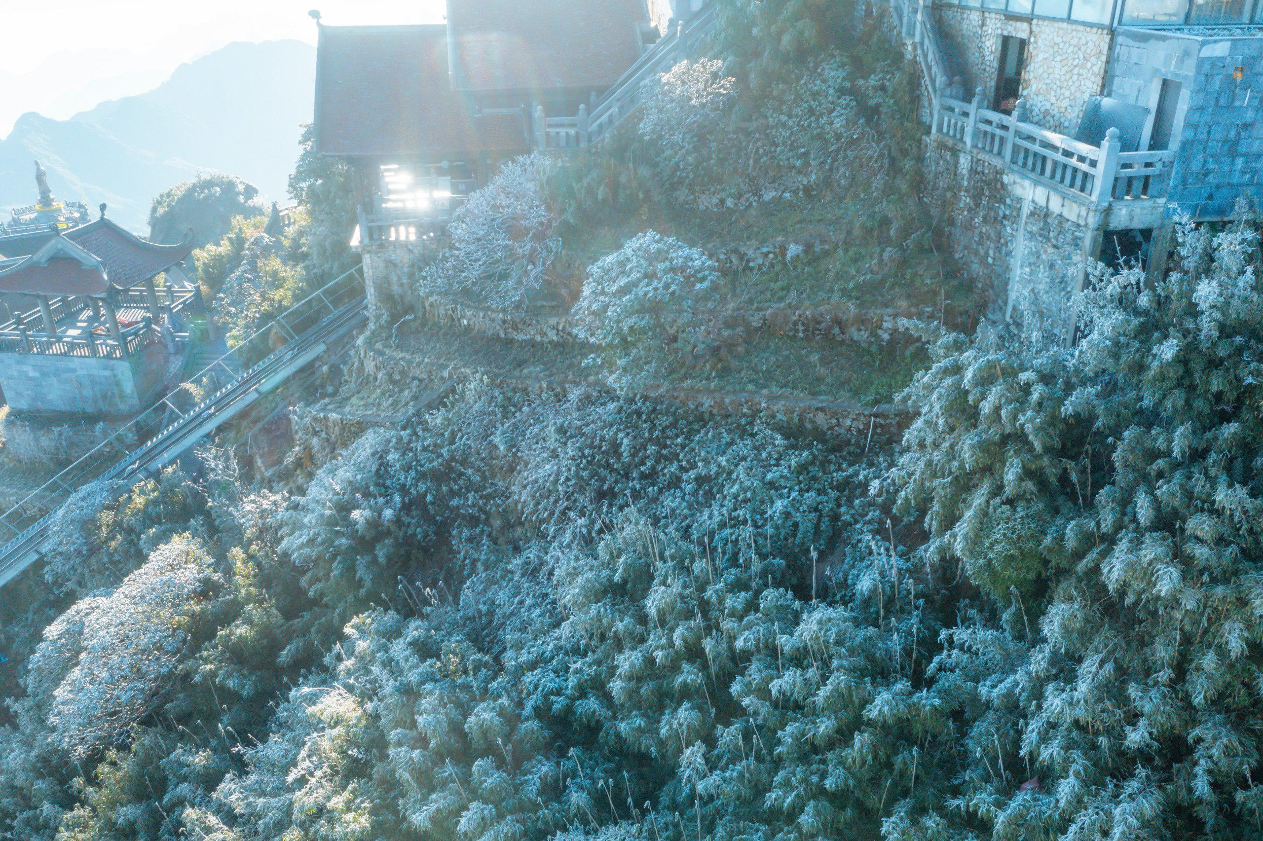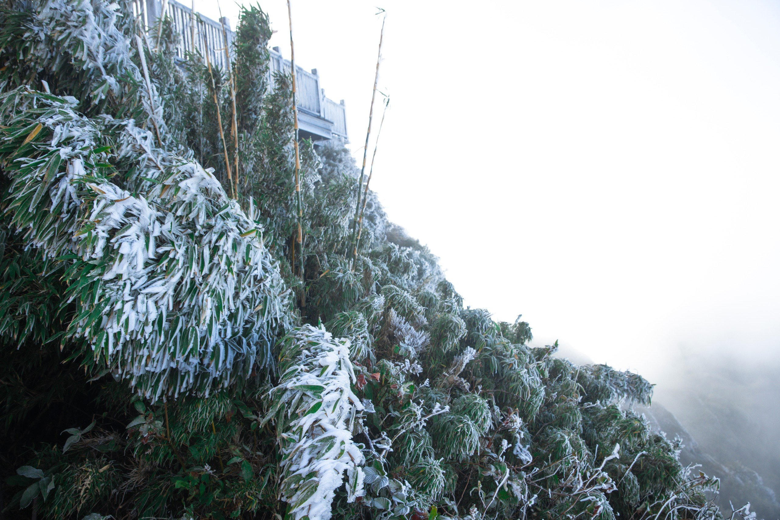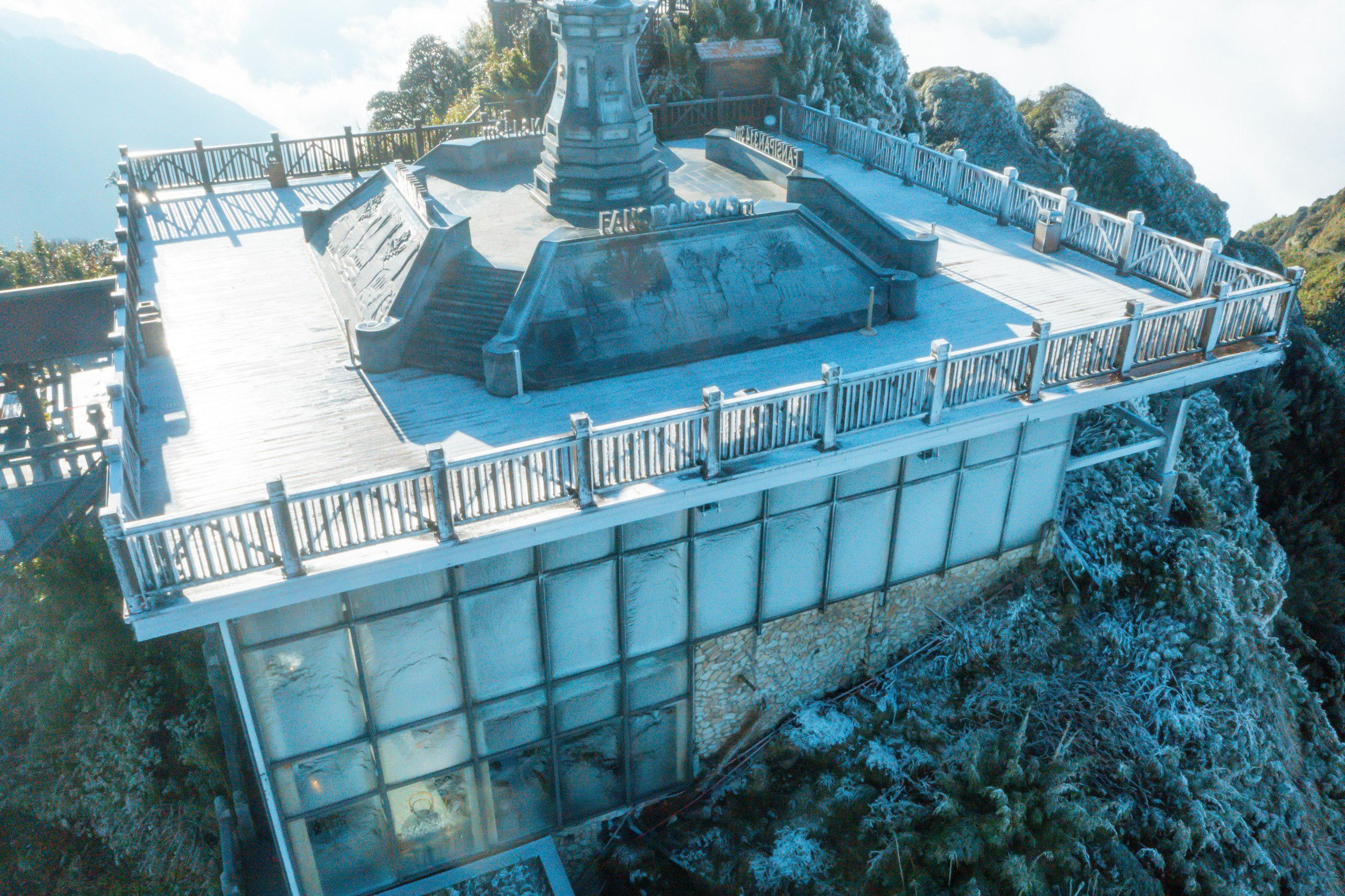 Sáng sớm 26/12, đỉnh Fansipan đã xuất hiện sương muối phủ trắng mọi vật, tạo nên khung cảnh đẹp mắt.