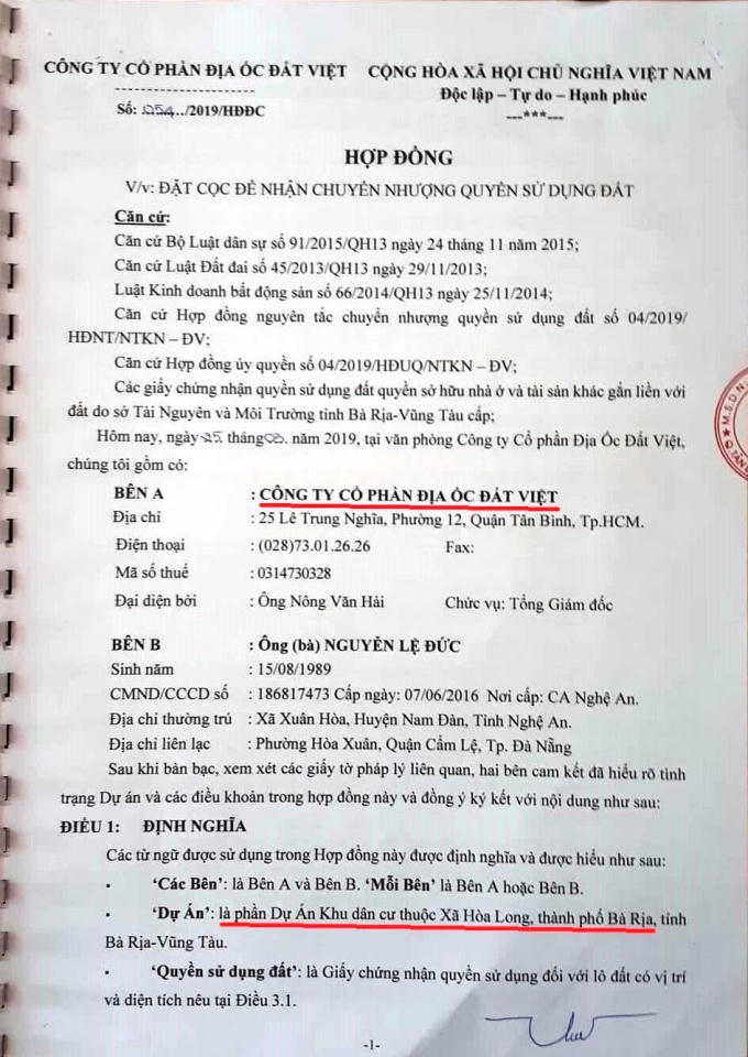 Sau khi xuống tiền, anh Đức và Công ty Đất Việt đã tiến hành ký 2 Hợp đồng về việc đặt cọc để nhận chuyển nhượng quyền sử dụng đất số 054/2019/HĐĐC và số 055/2019/HĐĐC đề ngày 25/3/2019 để mua 2 lô đất có mã số là 34/D2 và 35/D2 tại dự án Paradise City mà công ty Đất Việt giới thiệu. Sau đó anh Đức cho biết đã chuyển cho Công ty Đất Việt 1,6 tỷ đồng tiền mua 2 lô đất trên.