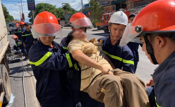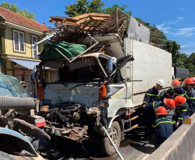Tại hiện trường, phần đầu chiếc xe tải bị biến dạng sau cú va chạm, tài xế bị thương nặng mắc kẹt trong cabin. Lực lượng chức năng đã sử dụng phương tiện chuyên dụng, tách phần cabin bị biến dạng đang chèn lên người nạn nhân, đưa tài xế xe tải bị mắc kẹt ra ngoài, chuyển giao cho lực lượng y tế cấp cứu.