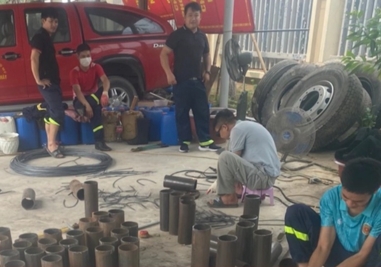 Cán bộ chiến sĩ cần mẫn tái chế kẻng chữa cháy.