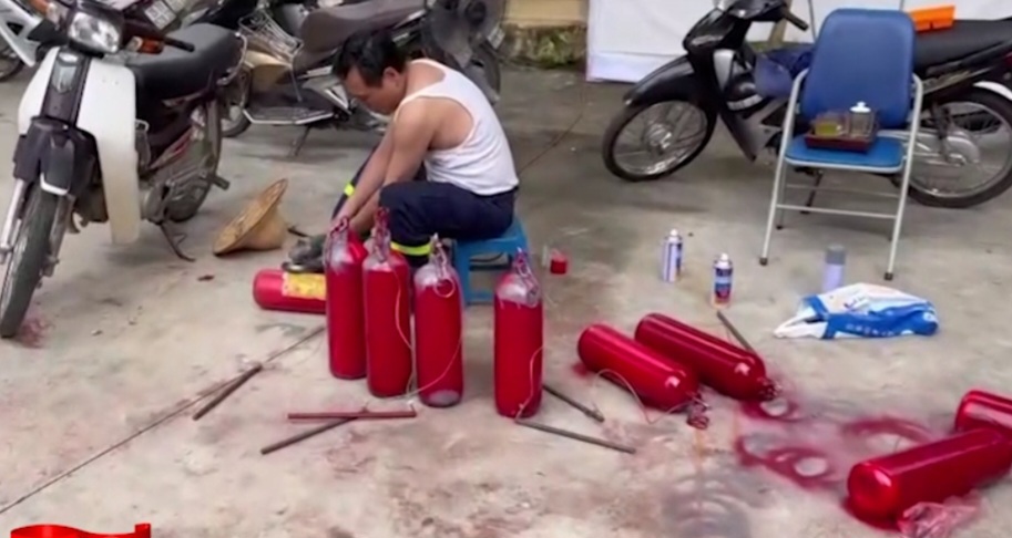 Cán bộ, chiến sĩ đã tái chế bình cứu hỏa cũ thành kẻng báo cháy.