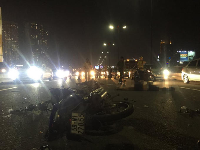 Tại hiện trường, thi thể cả 2 nằm chắn giữa đường, xe máy hư hỏng nặng. Vụ việc khiến nhiều người dừng lại trên cầu theo dõi khiến giao thông qua khu vực ùn ứ kéo dài.