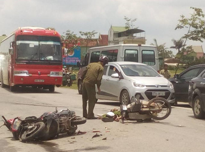 Cú tông mạnh khiến 1 người đàn ông mặc sắc phục công an tử vong ngay tại chỗ, người còn lại bị thương nặng, 2 xe máy bị hư hỏng nặng.