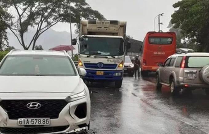 Ngoài ra, cùng lúc này, xe con mang BKS: 61A-578.86 đi cùng chiều phía sau không xử lý kịp nên tông vào xe tai nạn, hư hỏng phần đầu xe phía bên tài xế.