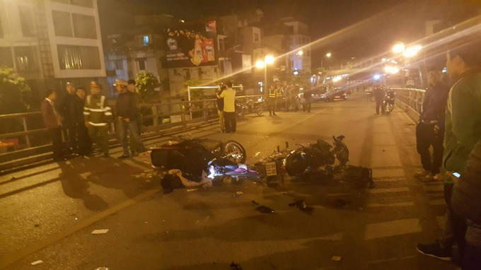 Quan sát tại hiện trường, 2 xe máy bị hư hỏng nặng, nhiều mảnh vỡ văng khắp thành cầu. Người nằm la liệt trên cầu.