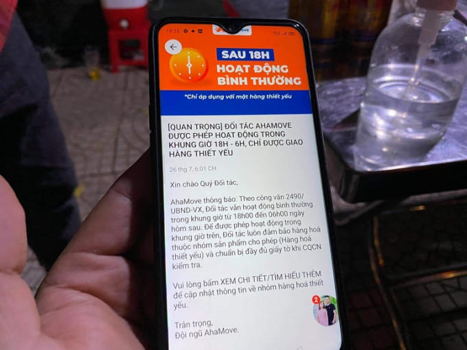 Nhiều tài xế giao hàng của hãng xe công nghệ AhaMove bất ngờ khi bị xử phạt vì theo thông báo của công ty, tài xế được phép hoạt động giao hàng thiết yếu từ 18h đến 6h sáng hôm sau.
