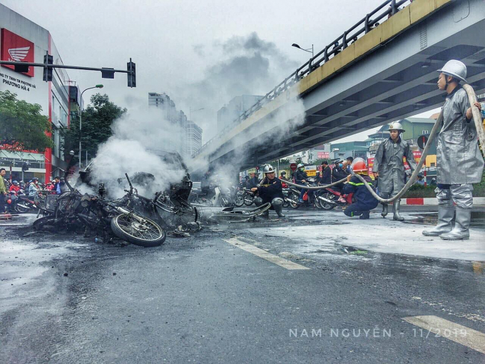 Theo ghi nhận của PV, chiếc xe ô tô mang thương hiệu Mercedes cháy trơ khung sau va chạm, 3 xe máy cũng bị cháy, chiếc xe đạp bị hư hỏng nặng.