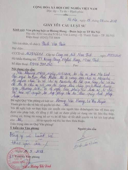 Theo đó, vào ngày 15/5, tài xế lái xe taxi Mai Linh Đinh Văn Điềm (SN 1981, quê Nam Định) bị đánh vào ngày 10/5 vừa qua đã viết phiếu yêu cầu gửi luật sư Hoàng Văn Hướng – Văn phòng luật sư Hoàng Hưng – Đoàn luật sư TP Hà Nội để bào chữa, bảo vệ quyền, lợi ích hợp pháp cho mình trong sự việc trên.