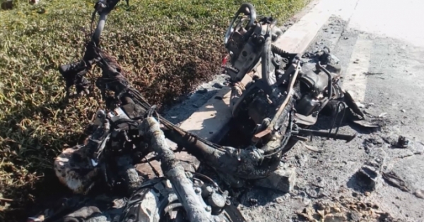 Xe máy ngã ra đường, người đàn ông tử vong tại chỗ, xe máy bốc cháy dữ dội. Tài xế xe bồn tăng ga tháo chạy khỏi hiện trường.