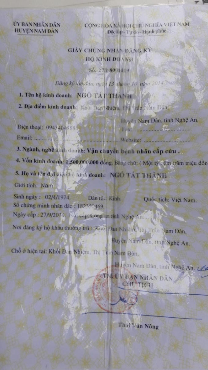 Các giấy phép như: Giấy chứng nhận đăng ký kinh doanh ghi rõ ngành nghề là vận chuyển bệnh nhân cấp cứu, giấy phép sử dụng thiết bị phát tín hiệu của xe được quyền ưu tiên... hộ gia đình ông Ngô Tất Thành đều có đầy đủ theo quy định của pháp luật. Đã 15 năm hoạt động trong ngành vận chuyển cấp cứu hộ gia đình ông Thành cũng là một trong những địa chỉ tin cậy mỗi khi người dân có nhu cầu sử dụng dịch vụ vận chuyển cấp cứu.