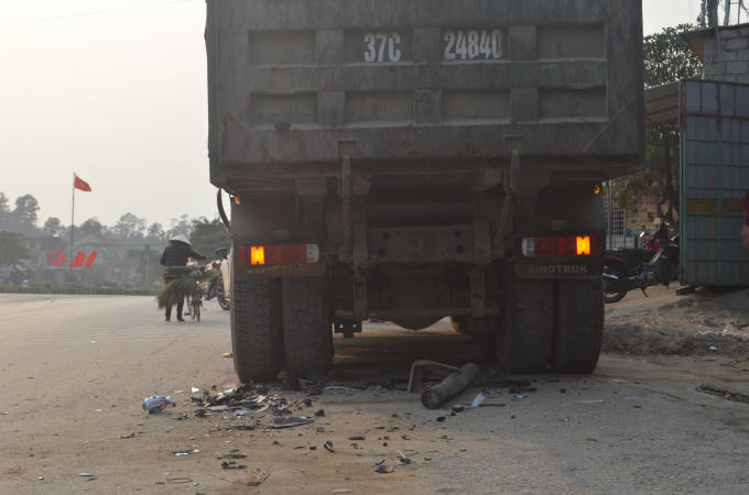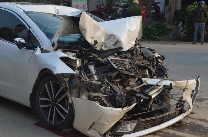 Tại hiện trường chiếc xe con bị hư hỏng rất nặng, biến dạng hoàn toàn phần đầu. Nhiều mảnh vỡ từ chiếc xe rơi xuống đường.