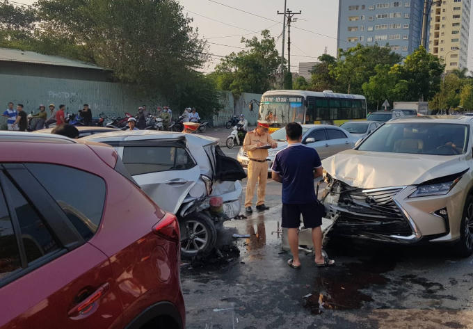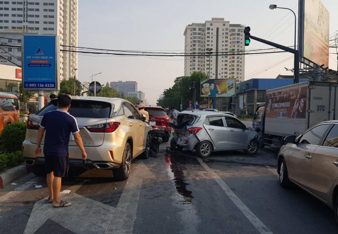 Vụ tai nạn giao thông liên hoàn trên khiến chiếc xe Hyundai I10 hư hỏng nặng, phía sau xe bẹp dúm; chiếc xe Lexus vỡ nát phần đầu; hai xe ô tô Mazda và Toyota Vios hư hỏng nhẹ; 2 chiếc xe máy hư hỏng và một người bị thương nhẹ.