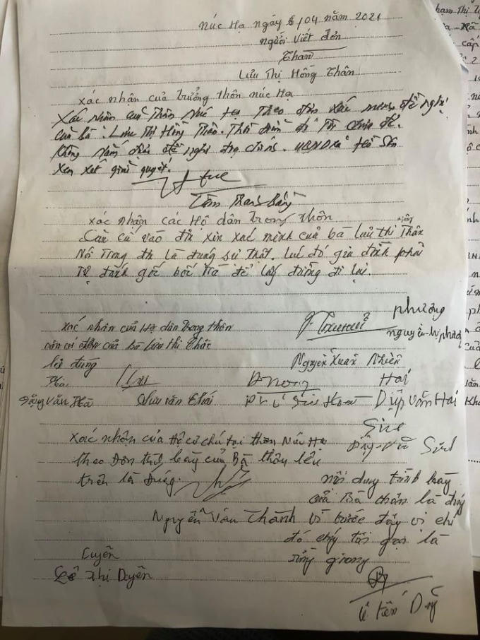 Đơn xin xác minh của bà Lưu Thị Hồng Thân có ý kiến xác nhận của nhiều phụ lão trong thôn về việc tự khai hoang, mở lối đi từ khi lập đất.